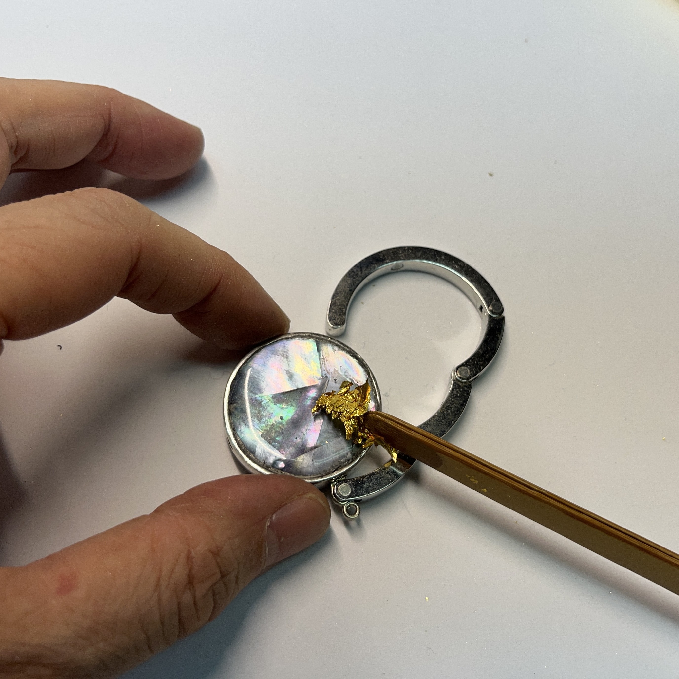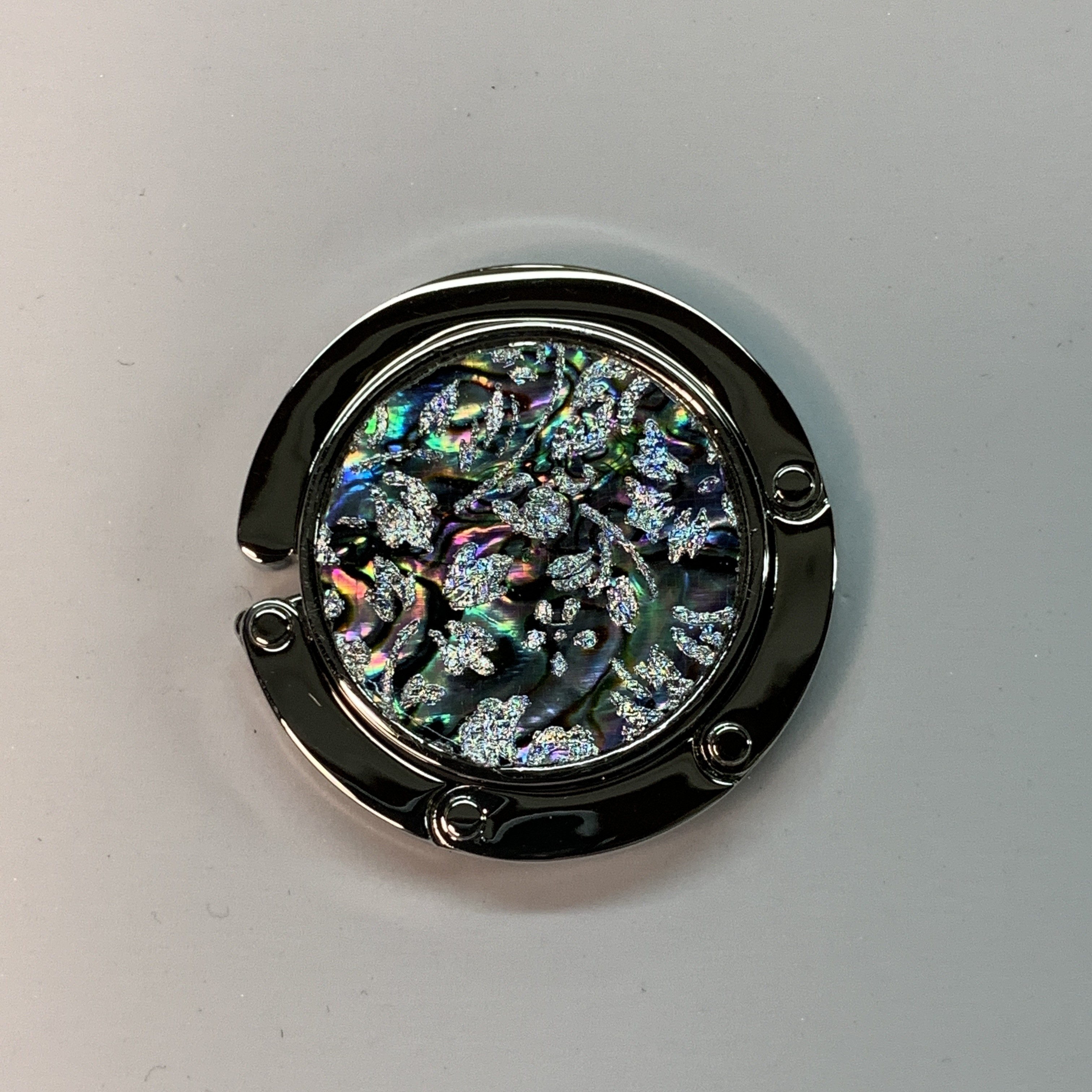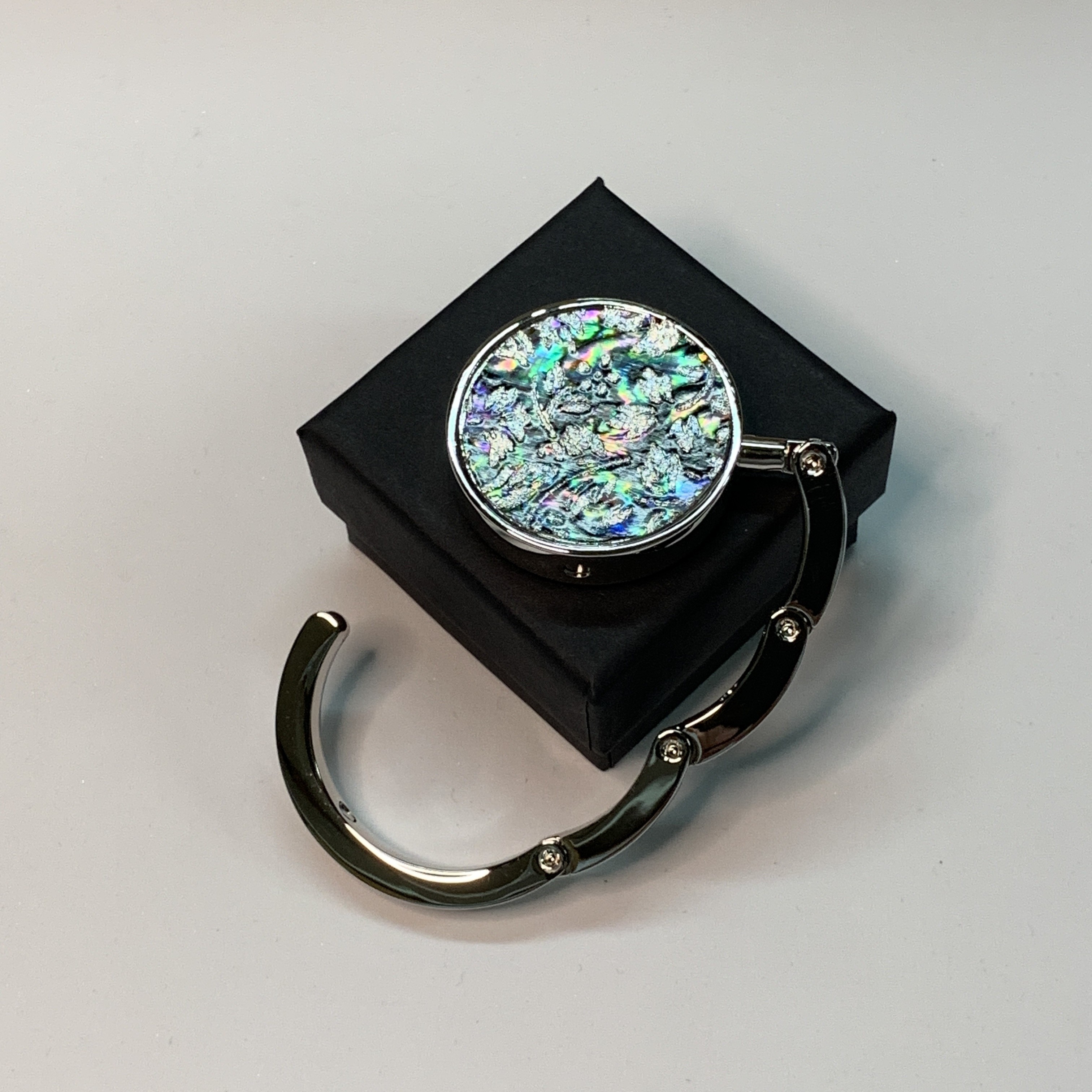 天然素材のアワビの貝殻の内側のエナメル質の部分を削り出した後、独自の技法にて螺鈿を加工してバッグハンガーに施しました。