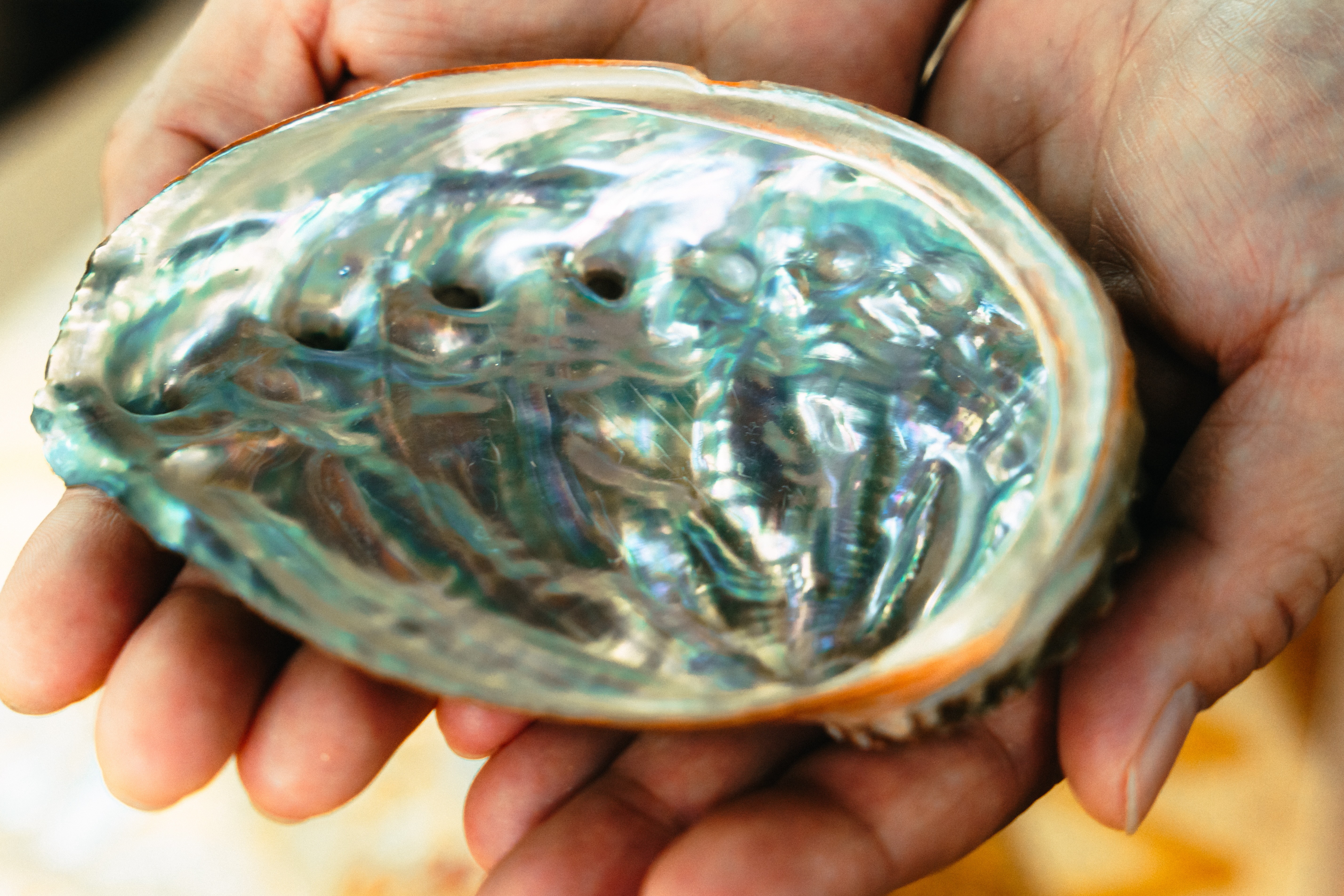 特殊技術により柔らかくしたアワビの貝殻の内側を螺鈿加工しています。